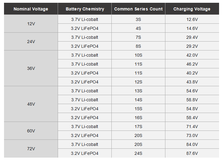 たとえば、7.4V、12V、24V、36V、48V、60V、72V など。