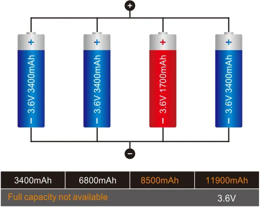 電圧は一定のまま、容量が追加され、内部抵抗が減少し、電源供給時間が延長されます。