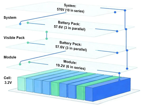 複数のバッテリーパックが接続され、インバーター/PCSと連携して完全なシステムを構成する。この場合、直列接続された2つのパックが720Vシステムを構成し、システムレベルのパックとなる。